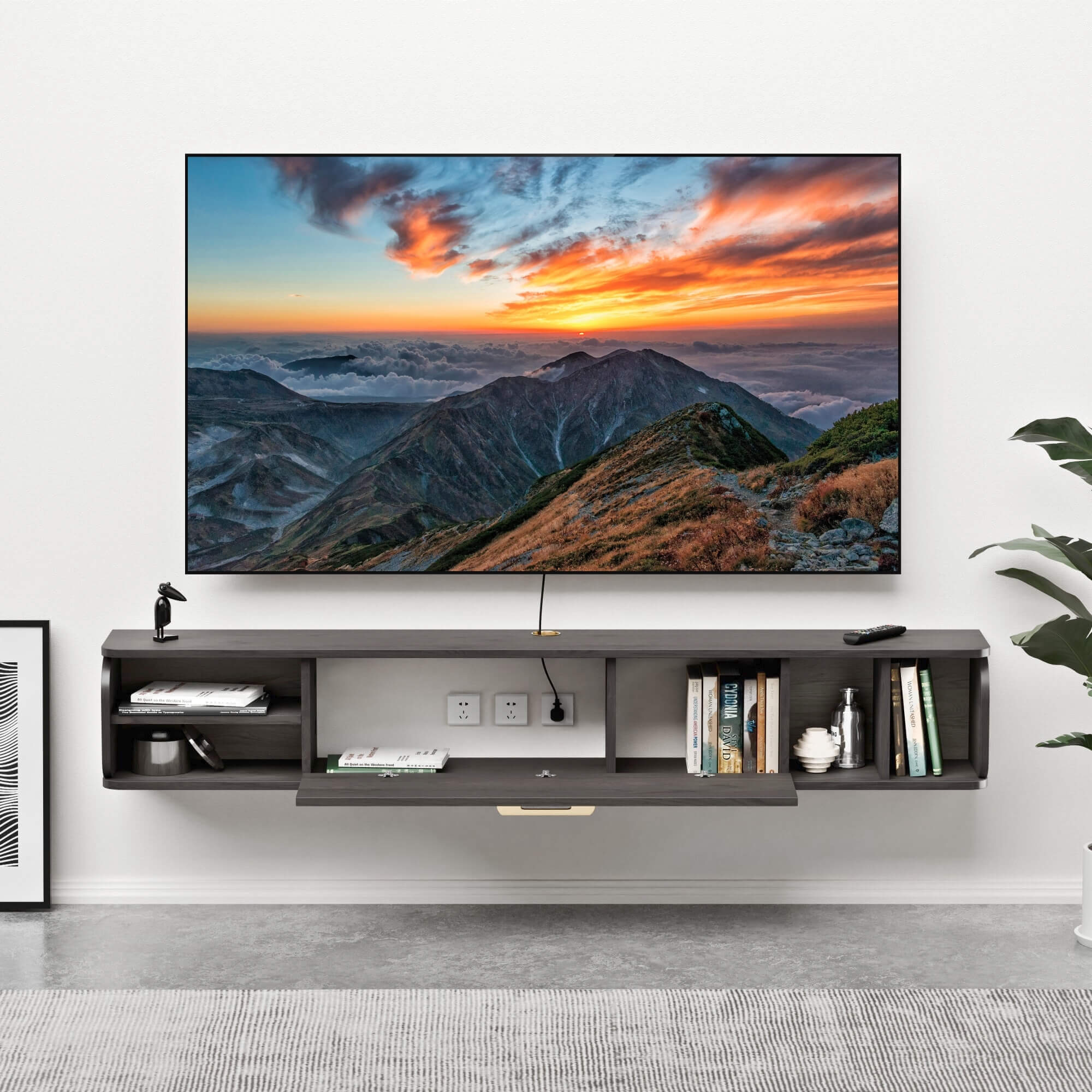 With its weathered varying and prominent wood grain, this floating TV stand will infuse any room with rustic style. Available in brown and grey for your preference. Combined with 1 large door and 4 open cubes, it provides with organized storage for cable boxes, CDs, DVDs, game consoles, projectors, TV components, etc. It also has wire holes on the top and bottom for easy concealing and connecting of all your cables. Made of solid plywood, this wall-mounted entertainment center has high stability and scratch resistance and is Not easily deformed or cracked.