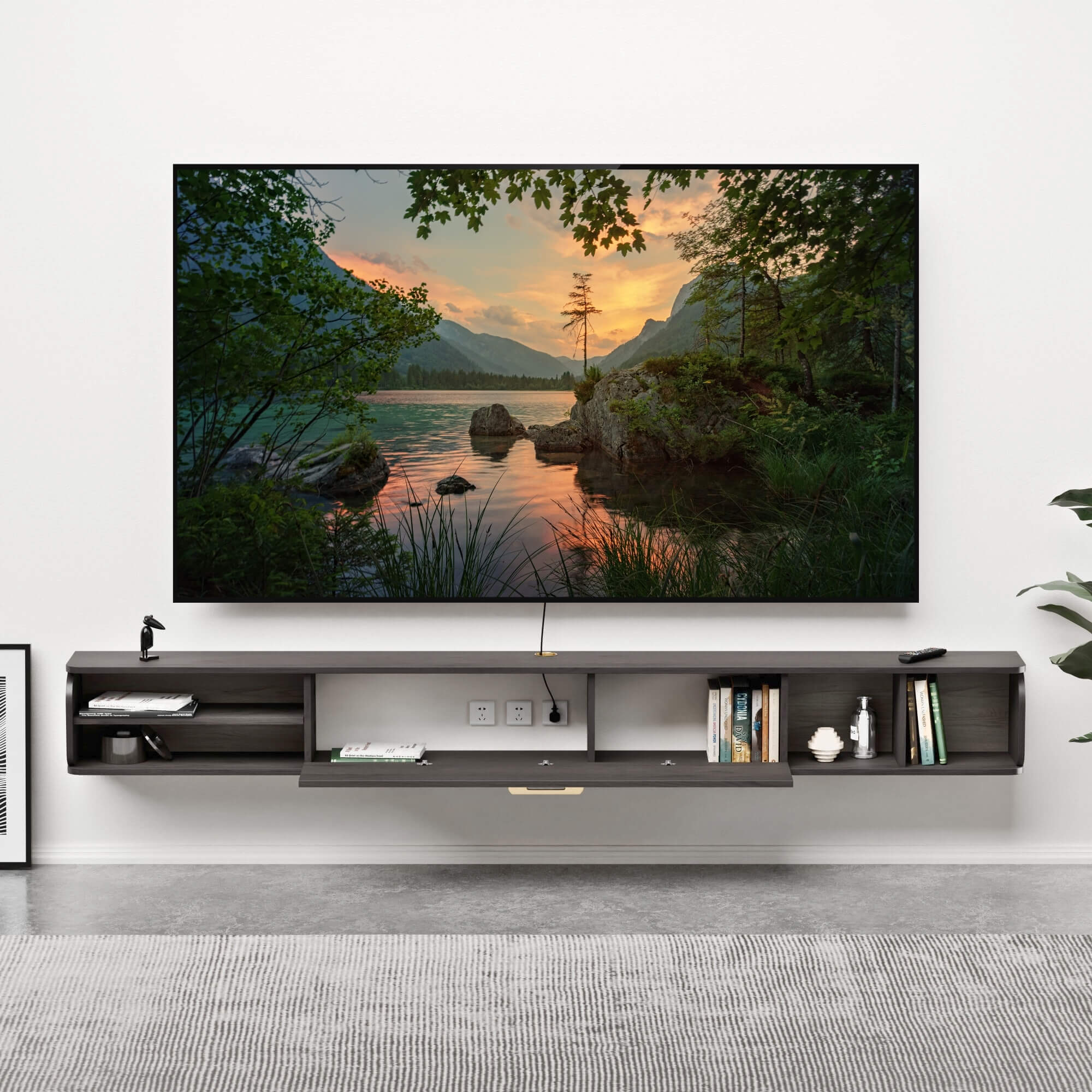 With its weathered varying and prominent wood grain, this floating TV stand will infuse any room with rustic style. Available in brown and grey for your preference. Combined with 1 large door and 4 open cubes, it provides with organized storage for cable boxes, CDs, DVDs, game consoles, projectors, TV components, etc. It also has wire holes on the top and bottom for easy concealing and connecting of all your cables. Made of solid plywood, this wall-mounted entertainment center has high stability and scratch resistance and is Not easily deformed or cracked.