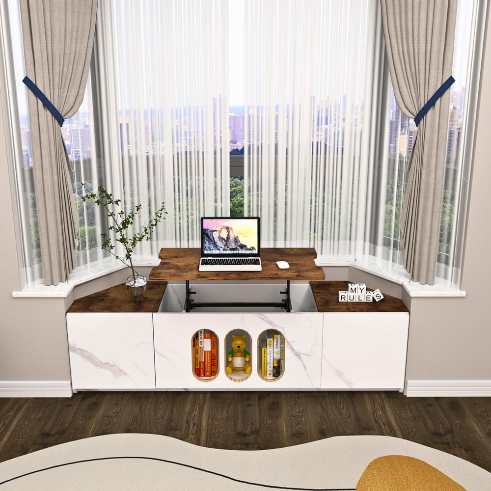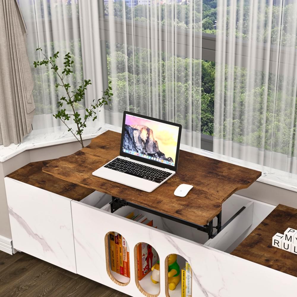 Custom Wooden Bay Window Storage Bench with Lifting Desk