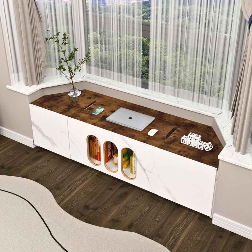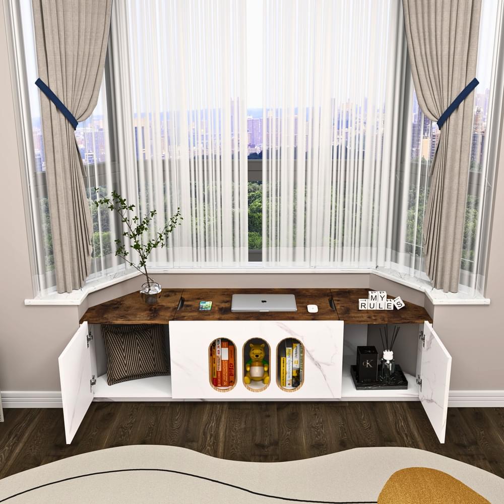 Take the unused or awkward space and turn it into extra storage and workstation. This wooden bay window bench features a hidden lifting desktop with adjusted range of about 9.8" in height and forward. The bottom front batten also leaves extra space for your feet, which enhances the comfort of sitting there to write or use a laptop. The flat across the front design with large cabinets provides as much storage as possible.